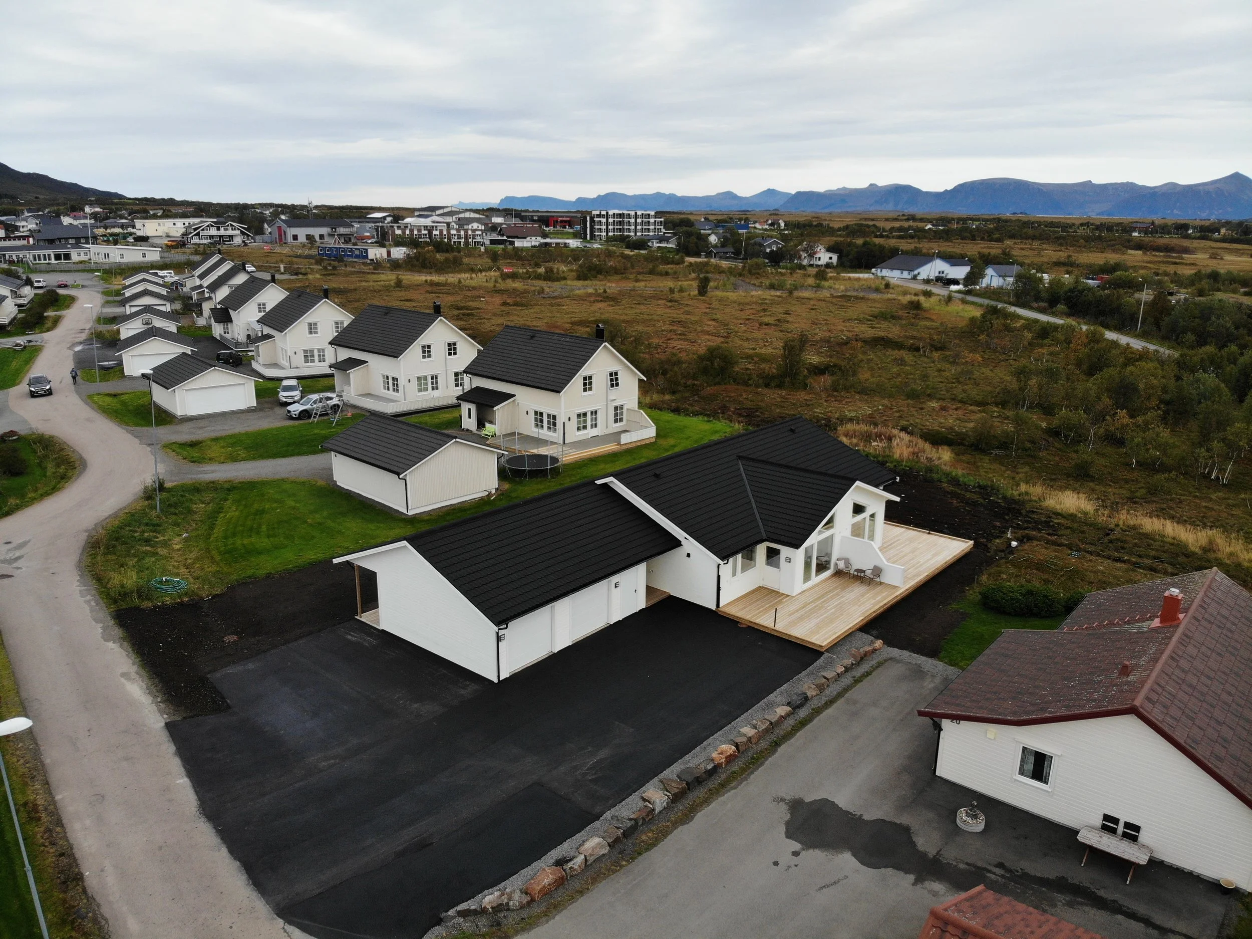 I Multebærveien 18 har vi bygd en lys og moderne tomannsbolig i klassisk nordisk stil. Hver seksjon har åpen løsning i stue/kjøkken, stor terrasse og egen tilhørende garasje. Inngang fra garasjen til leiligheten er under tak, perfekt for et komfortabelt bomiljø i nord-norske forhold. I utformingen av boligen har vi hatt fokus på lyse og effektive løsninger, både i eksteriør og interiør.